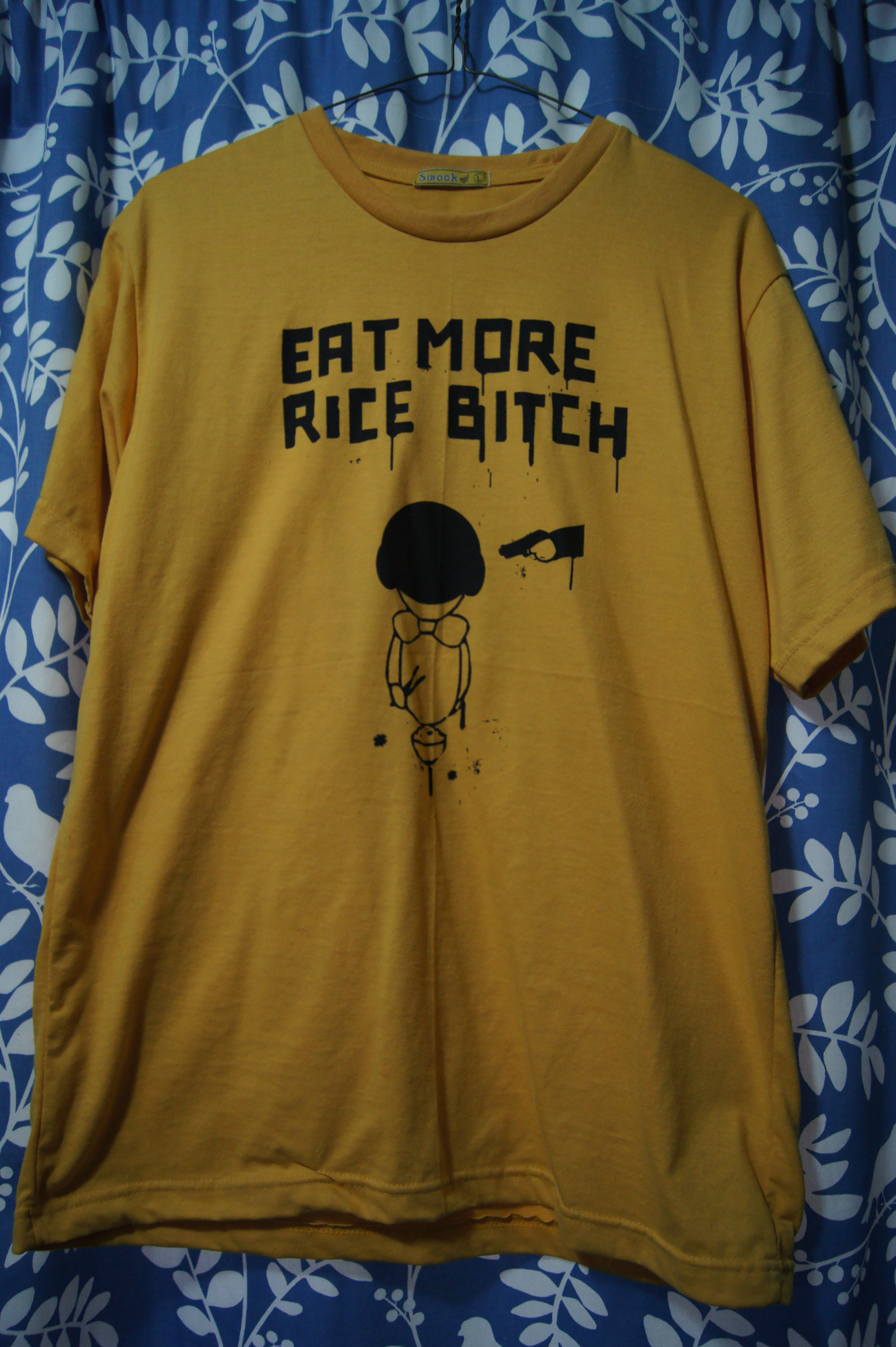 Now, let’s consider this shirt. In case you can’t clearly see what is going on, there is a person holding a gun to another person’s head. The thug is saying, “Eat more rice, banana head!” while the hostage sweats it out. Here’s the situation I imagine: