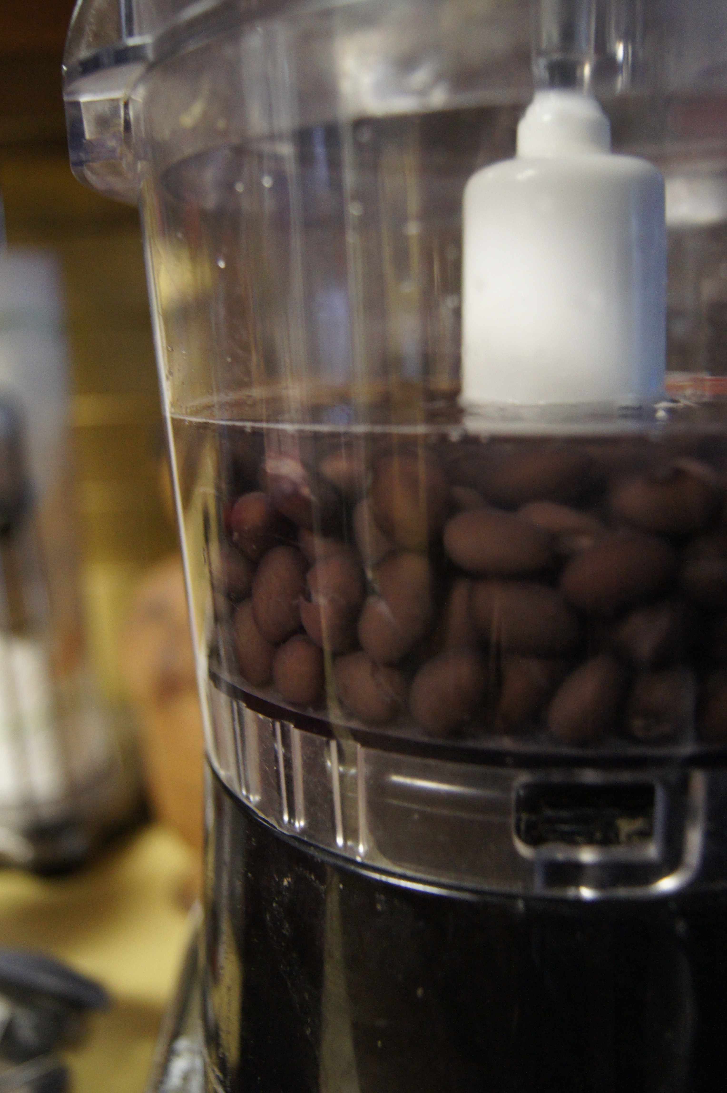 3. Now, you can add the whole can (beans + water) into a food processor. My food processor, which I love, happens to hate this recipe and shows it by spewing water and black beans into the air. As a result, I have to hold a towel around the processor and push the button at the same time, which requires the use of some of my feet.