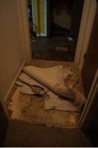 a thin piece of green posterboard, we decided to keep our bedroom door shut until we could find a more permanent solution. Enter the Dallas tornadoes last Tuesday. Gracie, who has never ever before been bothered by thunderstorms, went on a rampage. She knocked over a plant of mine, chewed up some mini-blinds, OH and did this little number. For those of you whose brain can’t comprehend what you’re seeing, that would be the carpet in the entryway to our bedroom. It appears that she attempted to dig her way into the bedroom so that she could destroy the posterboard.