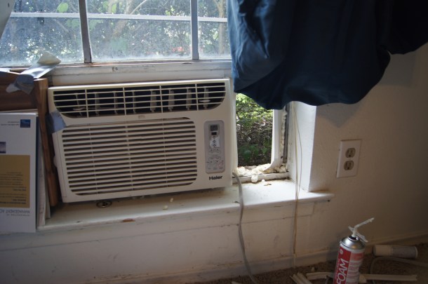 So…enter the window air conditioning unit that my parents LOANED us because the air conditioner in our duplex is original to the house. And by original to the house, I mean it’s probably 40 years old and can’t really get the temperature below 83 in the summer. To save some monies, my parents let us borrow the window unit so that at night, we can just have that running and the rest of the house can conceal a balmy 98 degrees.