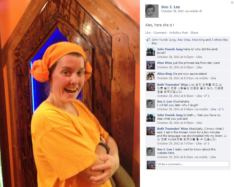 Afterwards, Soo took a picture of me (fully-clothed) and posted it to facebook to document for my husband that I was still alive and hadn’t been booed out of the bathhouse. Jokingly, I translated, “I ate kimchi dumplings and sat in boiling water with naked women. Now I am a real Korean” into Korean and posted it as a comment to the picture. Apparently, it doesn’t mean exactly what I thought it meant but none of my Korean friends have been able to articulate what it the Korean really means.