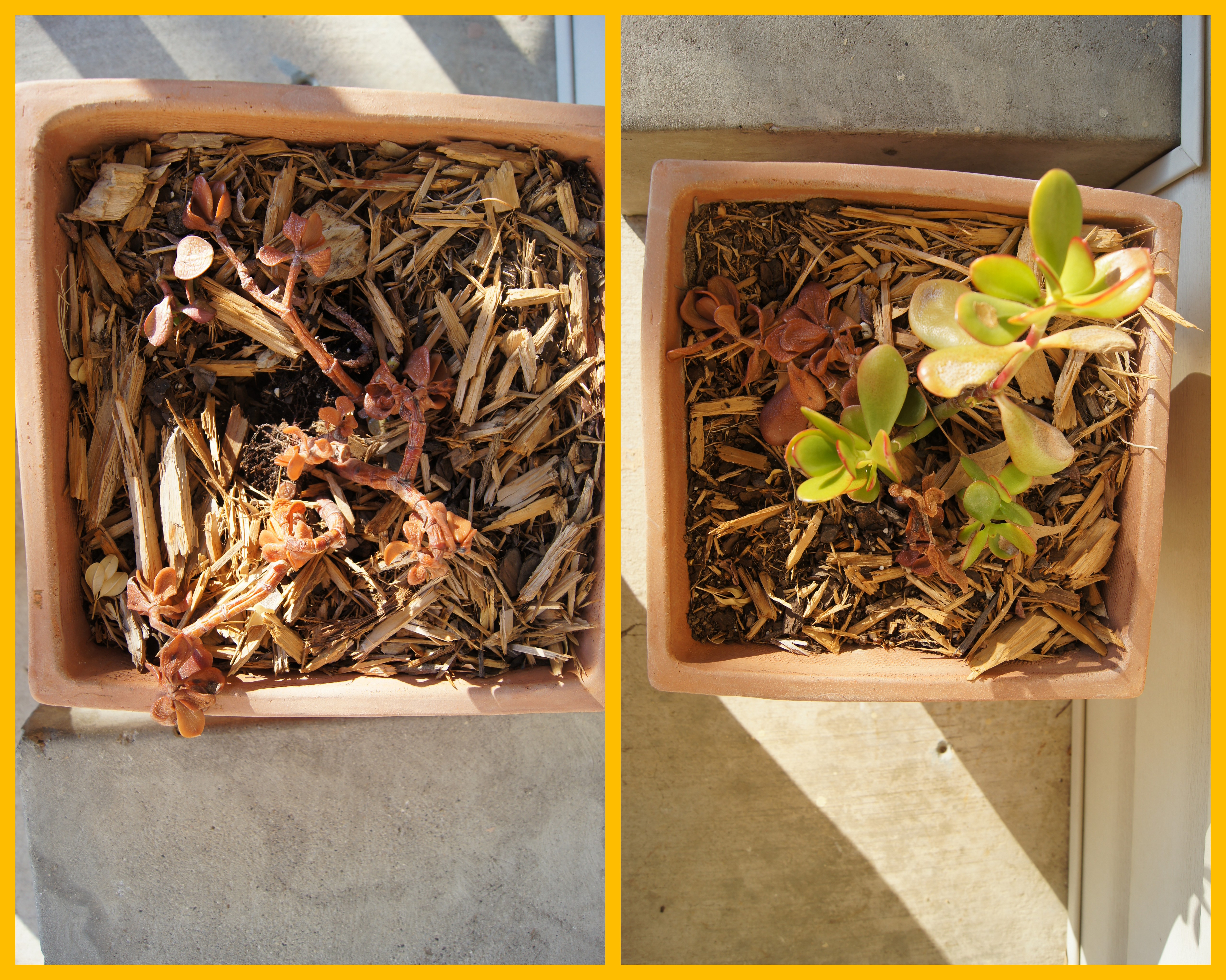 I bought the plant at a dollar store and when I repotted it, the pot was only big enough for half of the plant so I halfed it. The plant on the right was brought inside, sat in a warm window, and was doted on as it continued to stay green. The other half of the plant was left on our back patio in the scorching sun, tipped over on its side. When we moved here, I thought that these little buddies would be great door plants because it’s apparently a very hardy plant (one that I haven’t killed yet). So I scooped up the abandoned plant, which was still amazingly clinging on for dear life and dropped it into a pot.