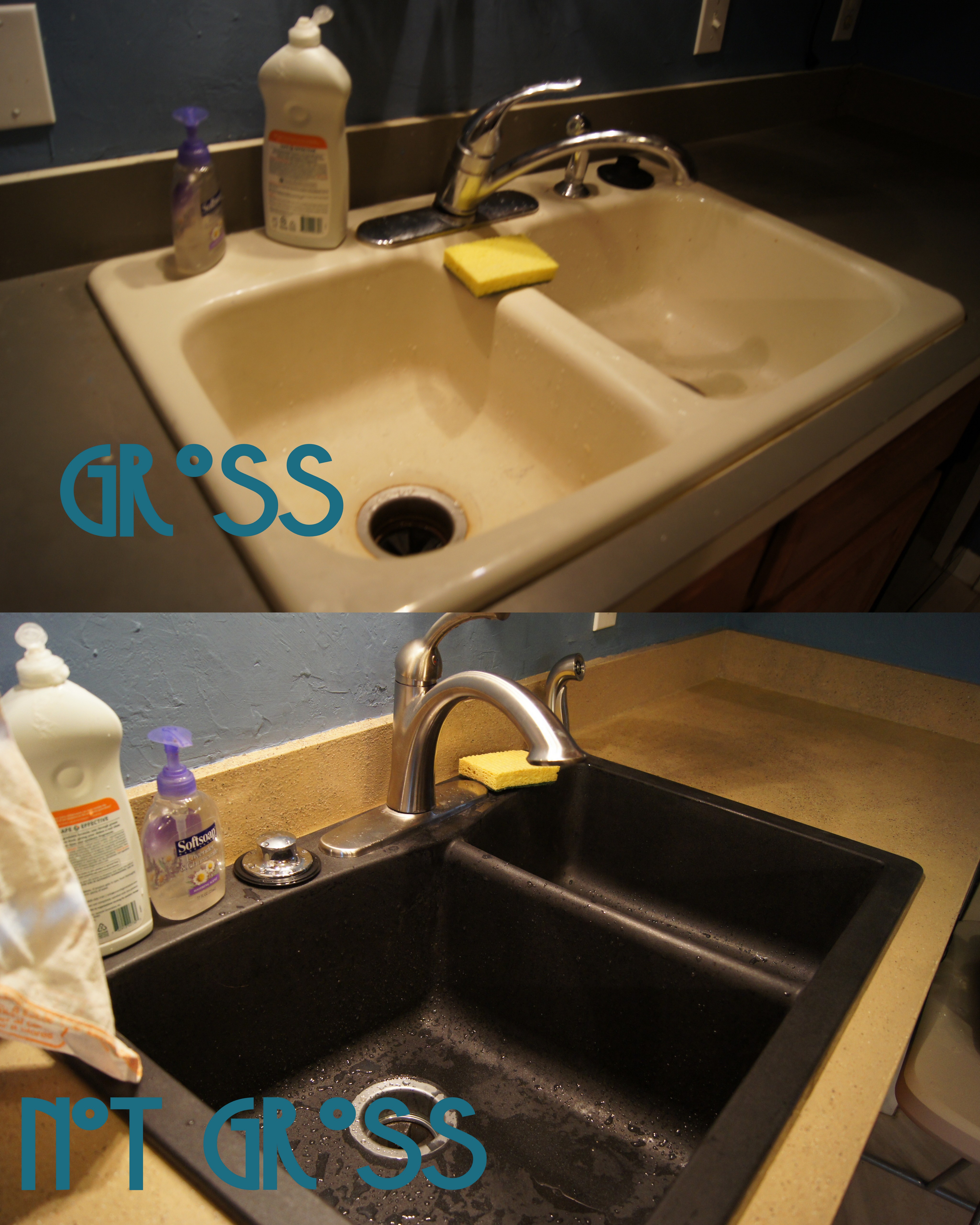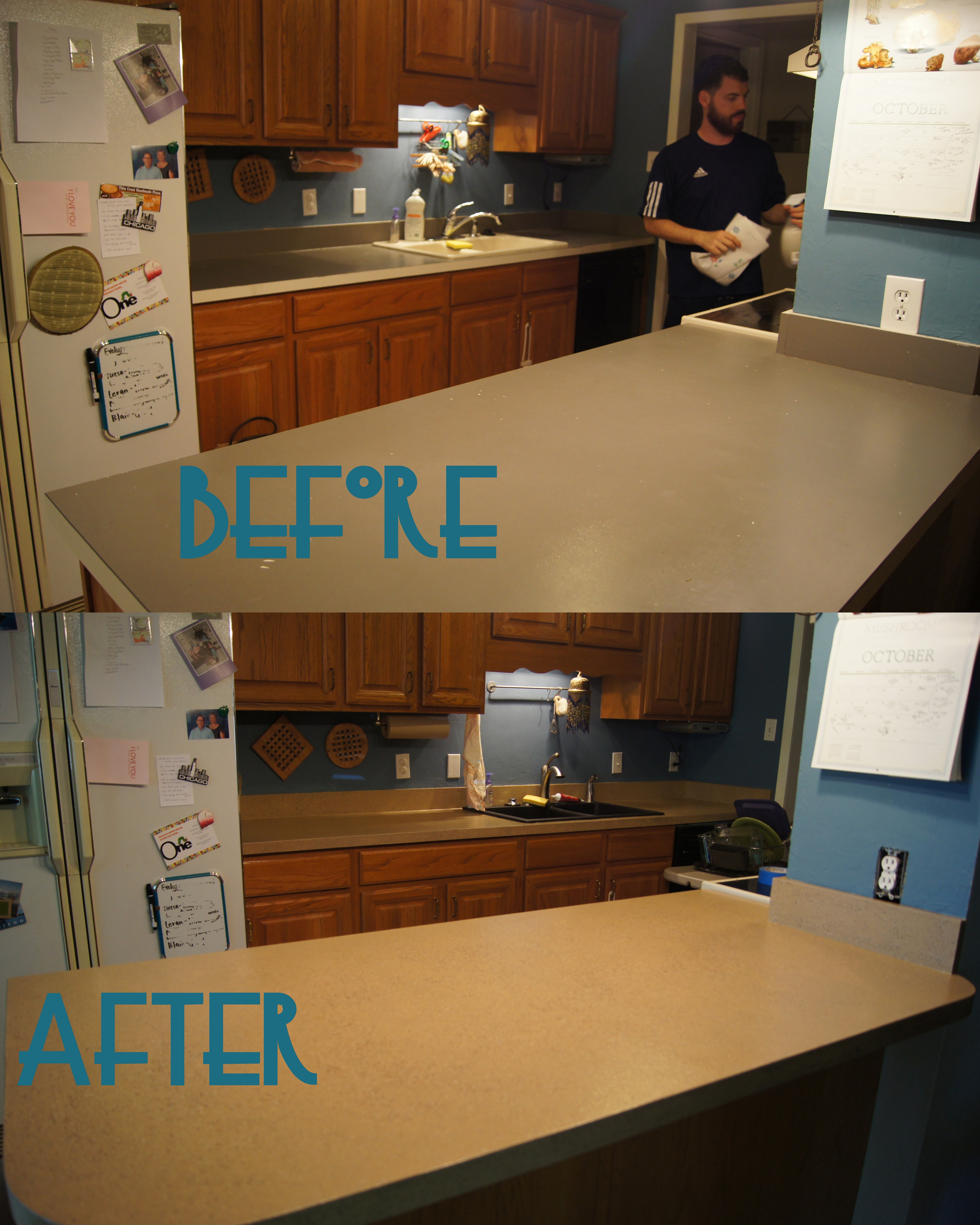 For my birthday, we re-did the countertops. Why did we have to redo the countertops? Well, the aforementioned  double blind previous owners painted the top of the countertops with gray, interior, flat wall paint, which now that I think about it, is probably the same paint that was used in the master bathroom which is so small that I can rest my head on the wall in front of me while sitting on the toilet. Now, let me go ahead and enlighten you that when one paints counter tops with interior latex paint, said paint gets chipped and if you leave a tortilla bag sitting on a wet spot, you will be able to read how many calories one tortilla contains for the rest of eternity. Also, while they painted the tops of the counter tops, they did not paint the sides so we had gray-topped counters with ivory edges interspersed with drippy gray paint because apparently painter’s tape hadn’t been invented yet.