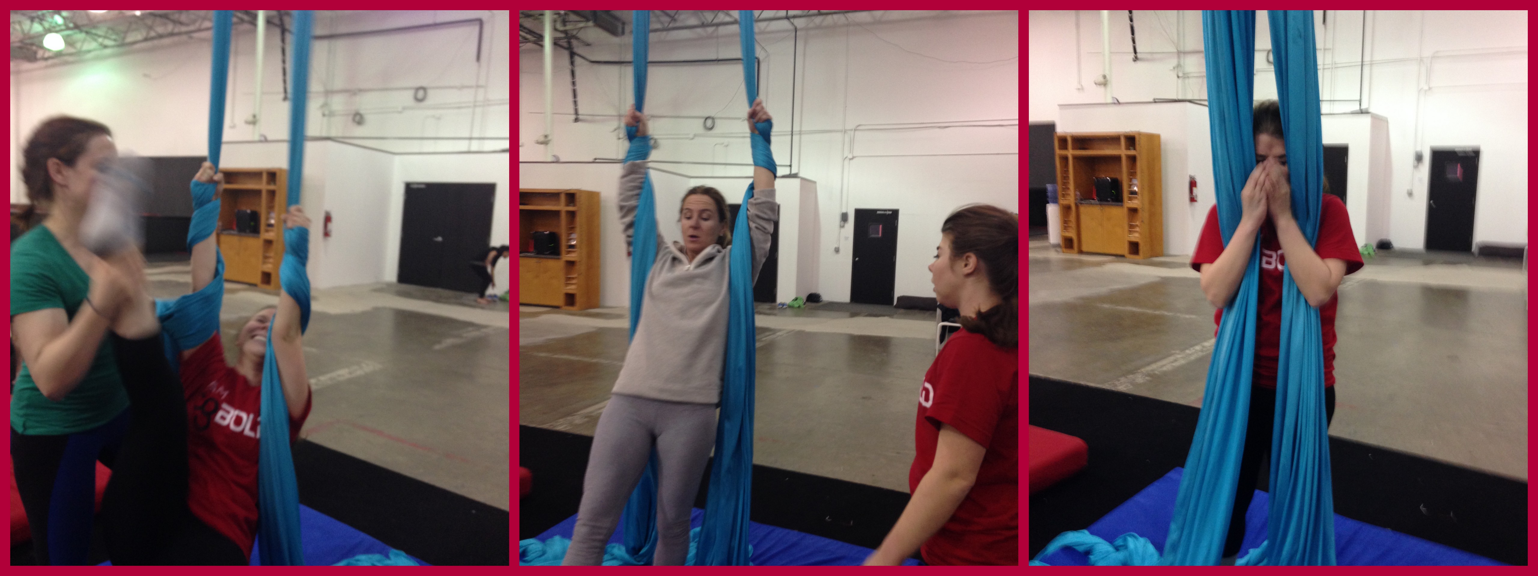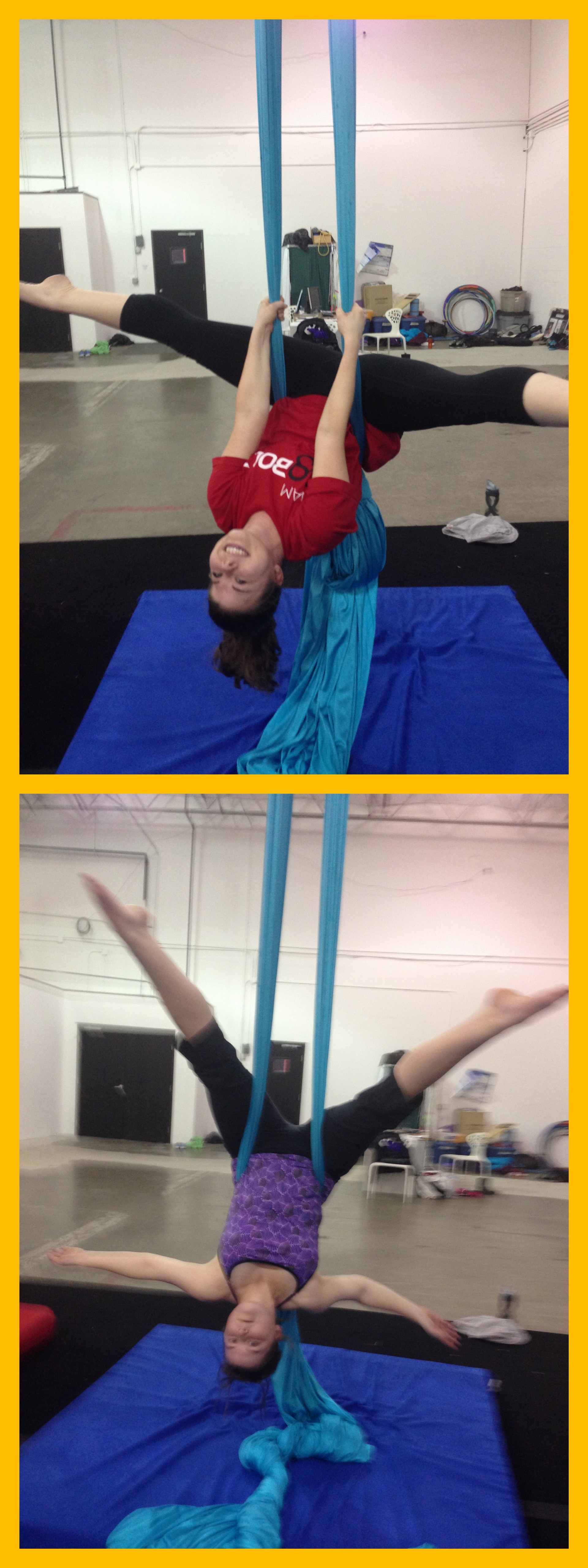 In order to do these moves, you wrap your arms in the silks, jump, and hurl your feet at your face so that you flip over backwards until your legs are straight up in the air. Once you got the hang of that, you were supposed to slowly scissor your legs to the front and back. Once you got the hang of that, you were supposed to slide your back leg down the silk until your back was arched and you looked really cool.
