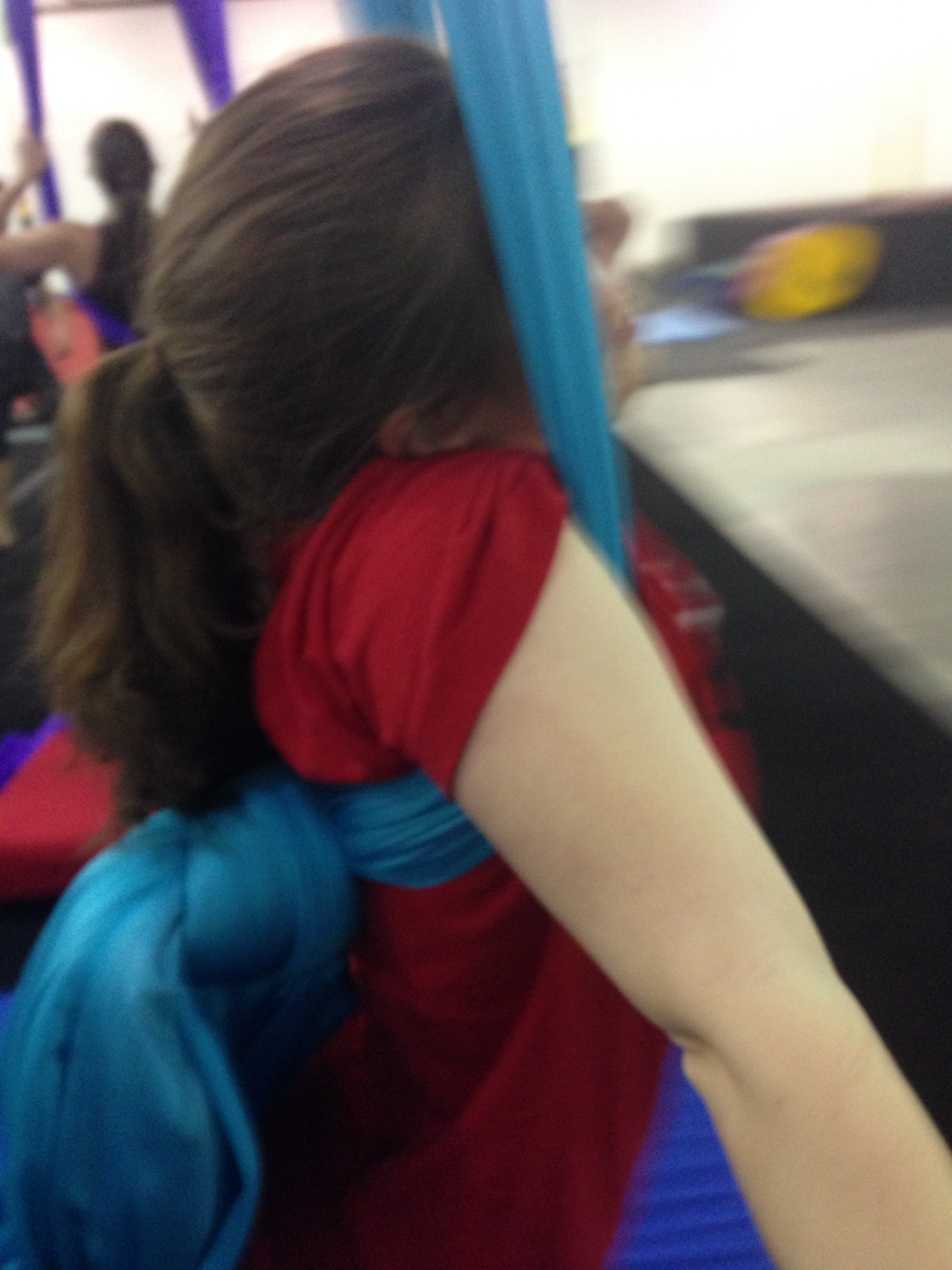 Now, she said, “This is a great one to give your muscles a break” and then she walked around tying knots in all the silks. Compared to trying to climb up a rope using tension in your feet, this was easier. Basically, you looped the silks around your back, flipped over, and then spread your feet out.