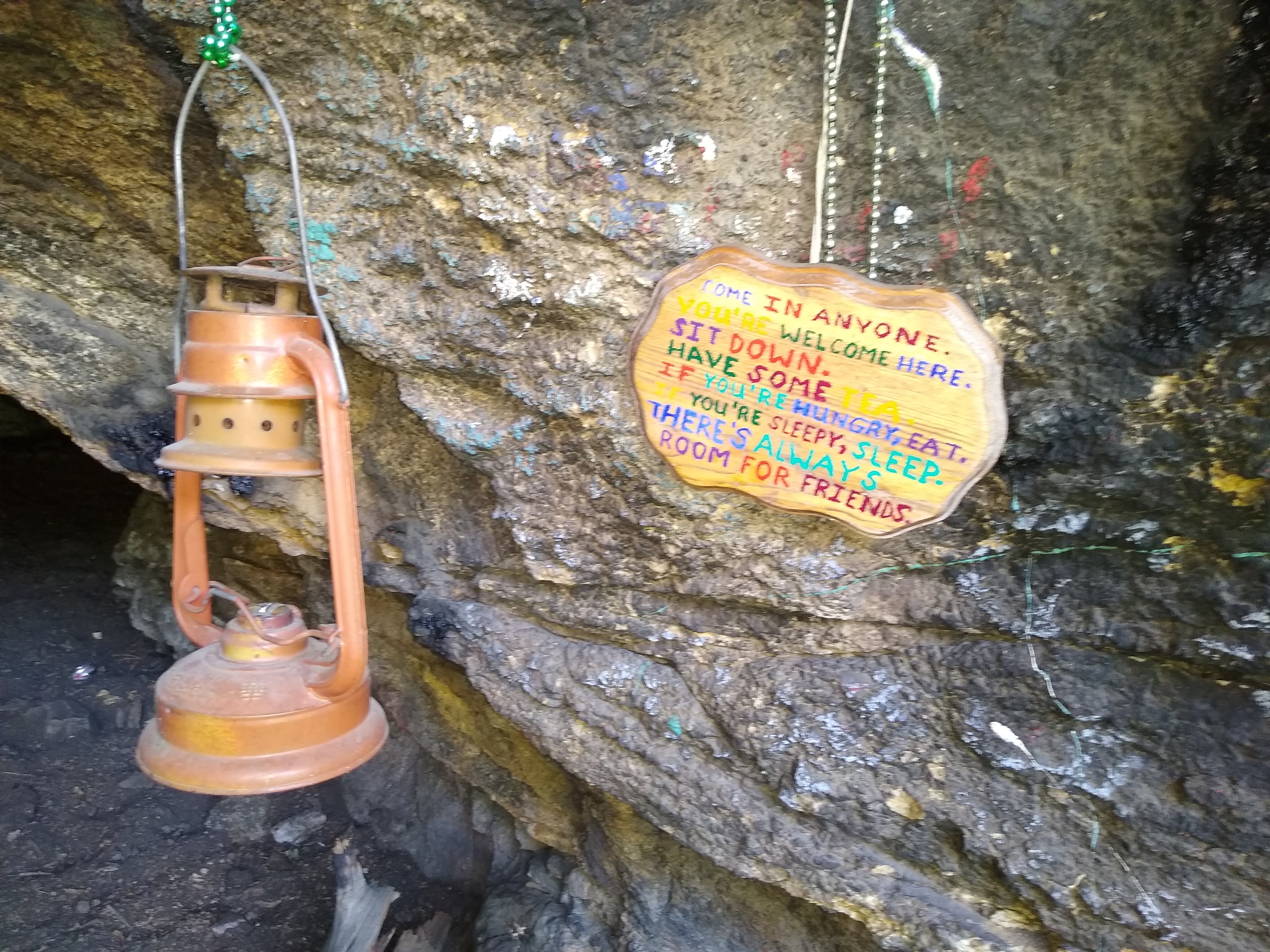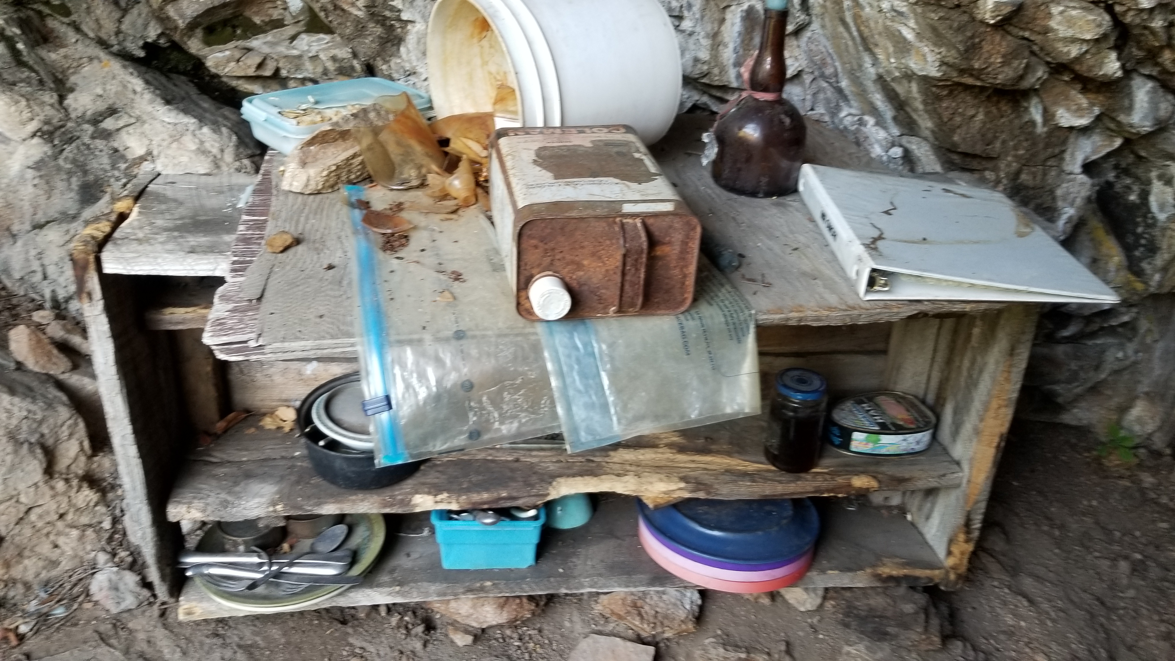 Fortunately, we were lucky and we finally rounded a corner onto a cave that backpackers use occasionally. It was WORTH IT, friends. So many weird things, like a James Patterson book in a tupperware container, a tea kettle, canned ham, everything you could possibly need for a night in the mountains.