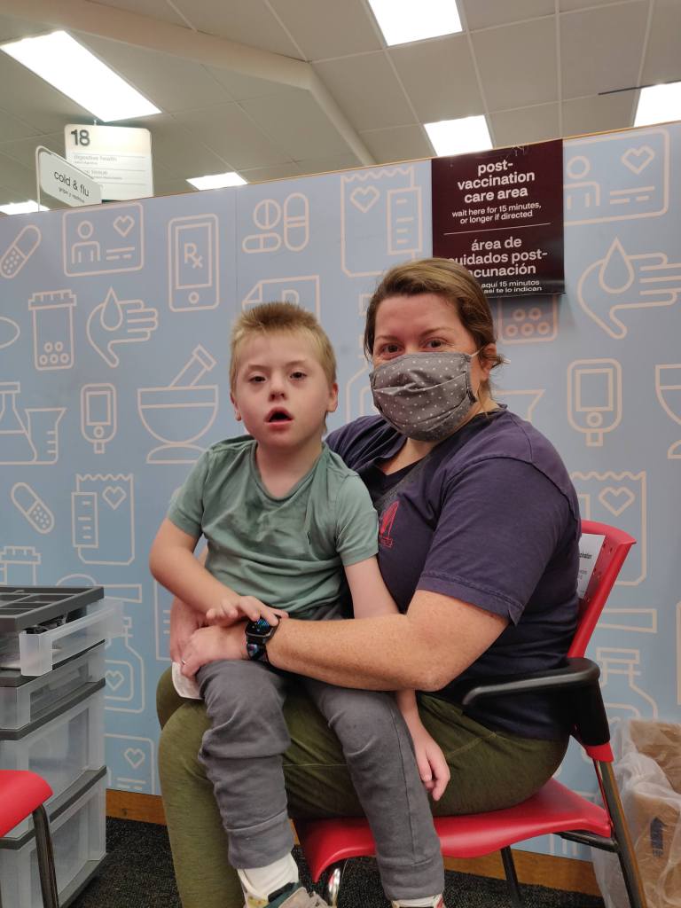 Yesterday, I picked him and his nurse up from school a few minutes early and we drove to a CVS twenty minutes from our house and sat behind a weird curtain and he got his first COVID vaccine.