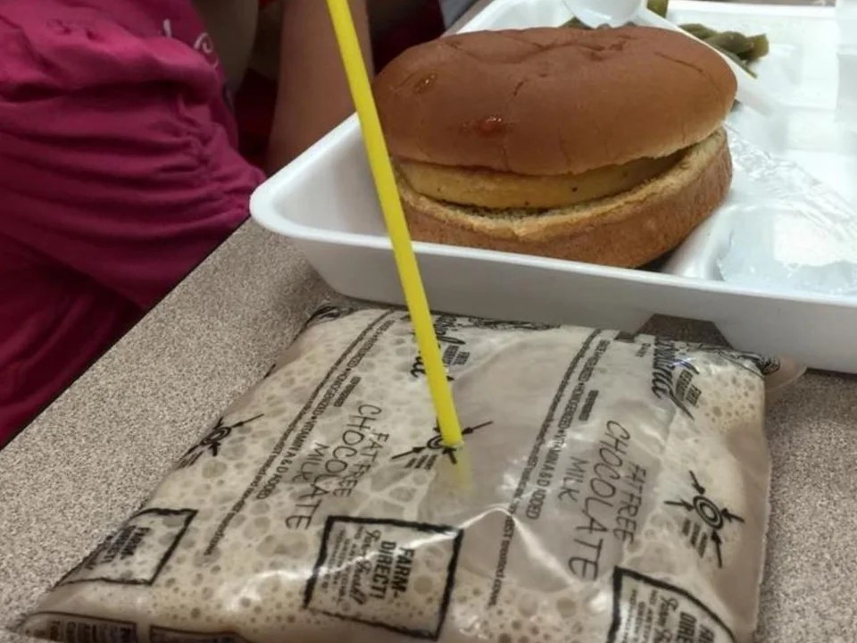 Perhaps you’re picturing something like a CapriSun- a sturdy, semi-metal bag of juice with a clear top and reinforced bottom. Unfortunately, the bags of milk looked more like a Ziploc- a thin plastic bag of liquid that one was supposed to carefully pierce with a pointy plastic coffee-stirrer-sized straw.