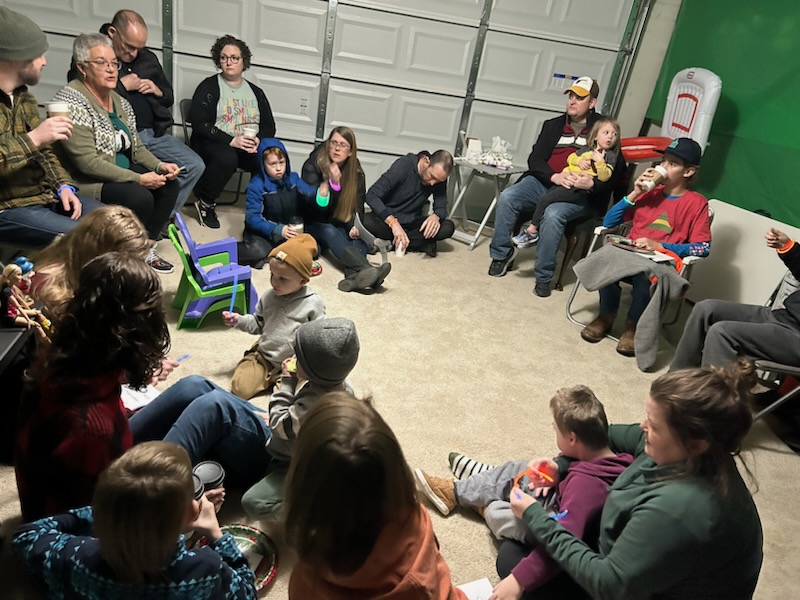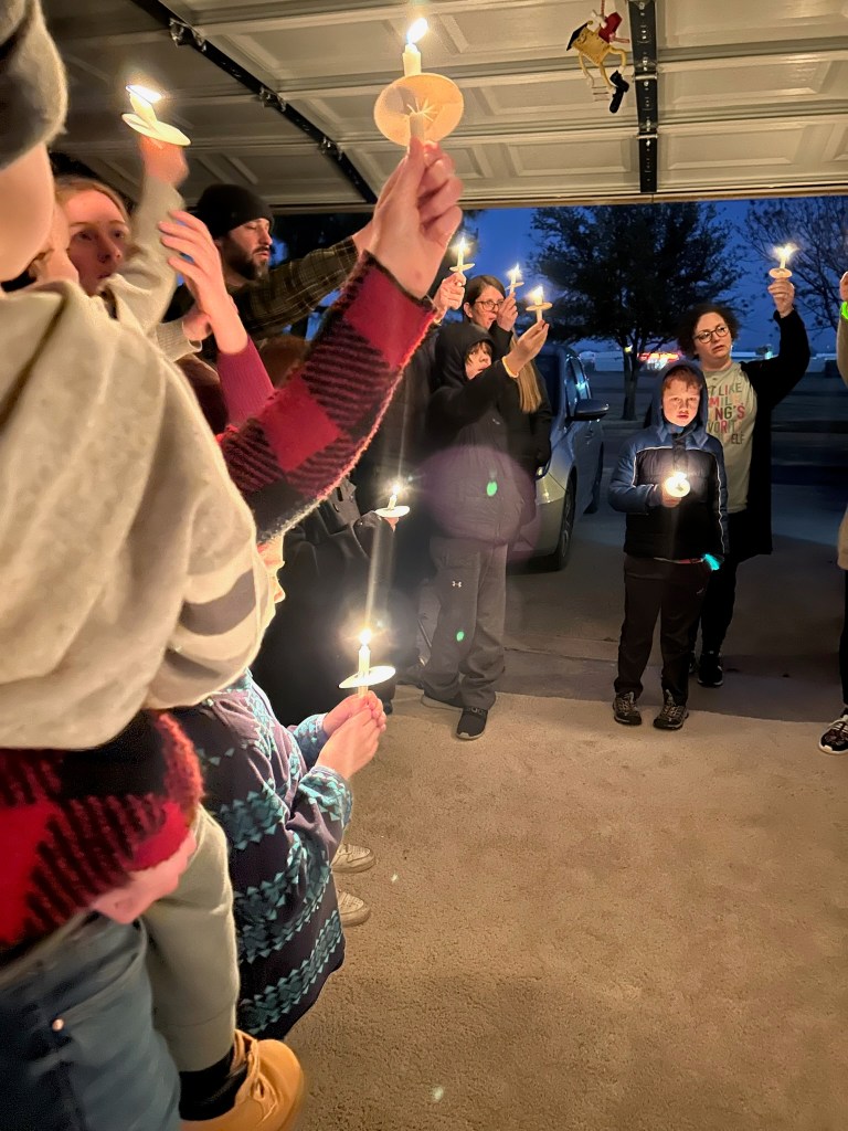 Tonight, we hosted a candlelight service in my parents garage. The tools and old signs and bicycle wheels are half covered by tasteful plastic green tablecloths. A rug punctuated with stains, both old and new, adorns the floor. We sang hymns and listened to a homily and the motion sensor garage door light kept going off during the candlelight part but God was there anyway.