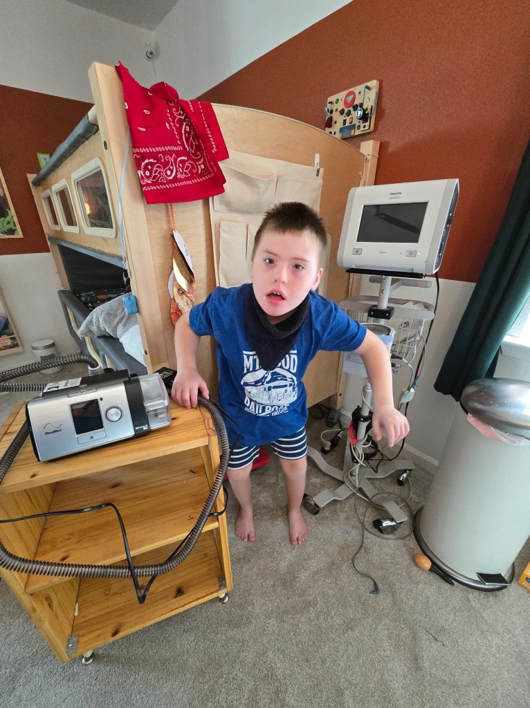 That was seven or eight years ago. And we learned to live with the armless Transformer. Like many disabled people and their caretakers, we figured shit out. I crafted an apparatus out of foam blocks to keep him from rolling onto his stomach and smashing the exhalation valve of his mask into his mattress and causing the alarms to scream. We figured out the best way to put the mask on without waking him. We learned how to hack into the stupid fucking thing to turn the most egregious alarms off, shushing them sarcastically. “Blah-blah-blah. He’s a mouth-breather. We get it,” we metaphorically told the screeching alarm harpies as we used secret passcodes and hand motions to get into the settings meant for professional eyes only.
