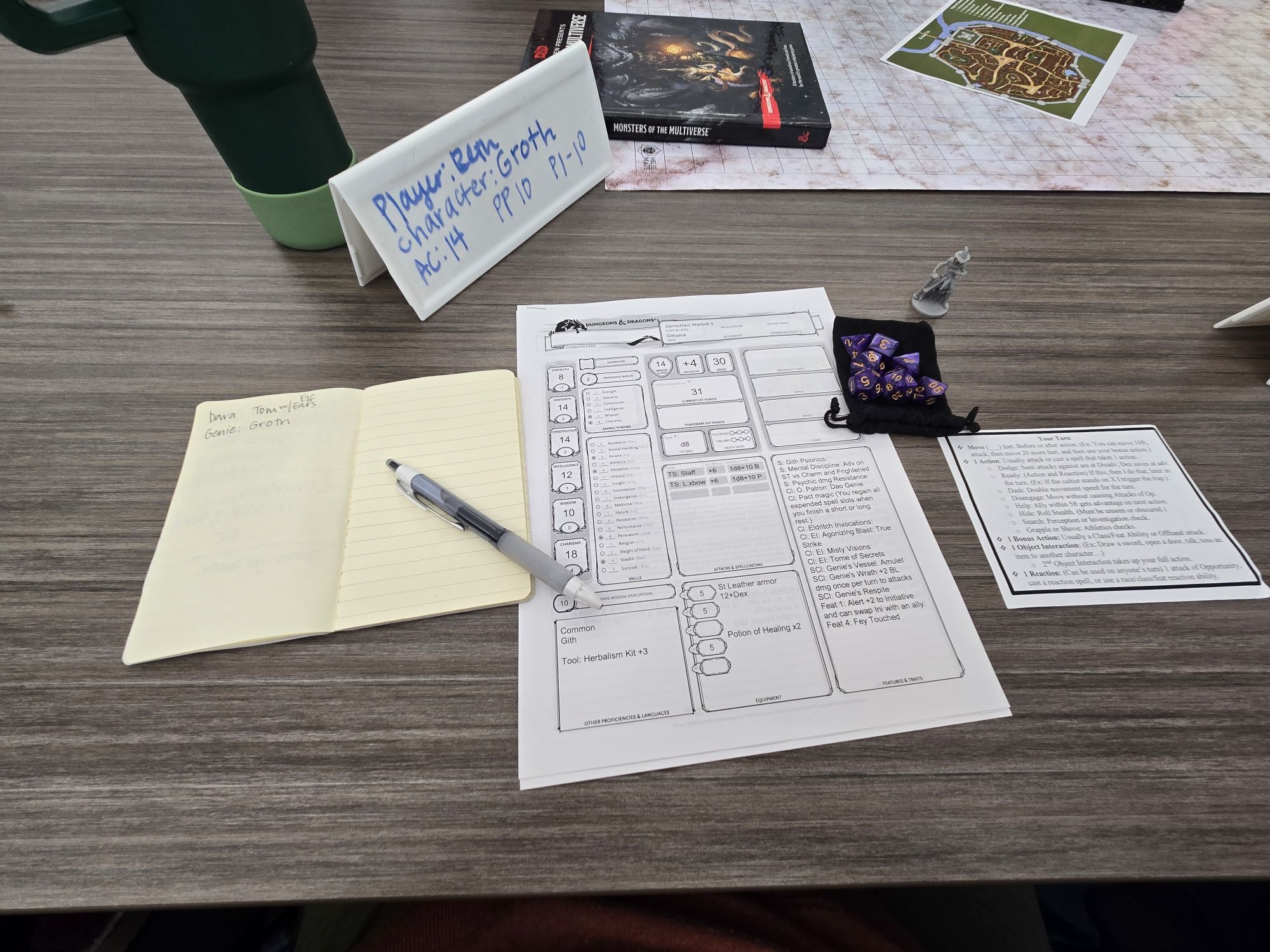 For the rookies, there were premade character sheets. I studied them, but the statistics were meaningless to me. I chose a Genie Warlock because that sounded cool. My race was listed as Githrezai. Perched on my sheet was a little 3-D printed wizard with a pointy hat and a long robe.